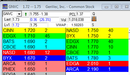 GNVC = Model went long 3,000 shares at $1.53 - stock is currently $1.72 - high $1.75 (see image) up 26% - SELLING HALF HERE 1,500 shares at $1.73 to $1.77 - RAISE STOP $1.65 on last