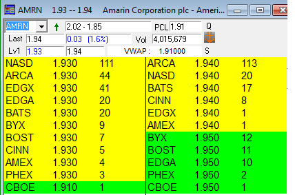 AMRN = SOLD 20,000 of the 30,000 shares - sold the $1.87 and $1.89 blocks and still have the $1.79 block. I will be selling half that also into the next run back to $2.00 - I will hold 5,000 just for kicks. Thanks for the $6,000 profit - So Happy About AMRN.