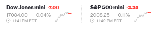 Futures down not that much see a down opening. Dow Jones Mini -21.00 & S&P -4.75 should be an exciting week ahead.