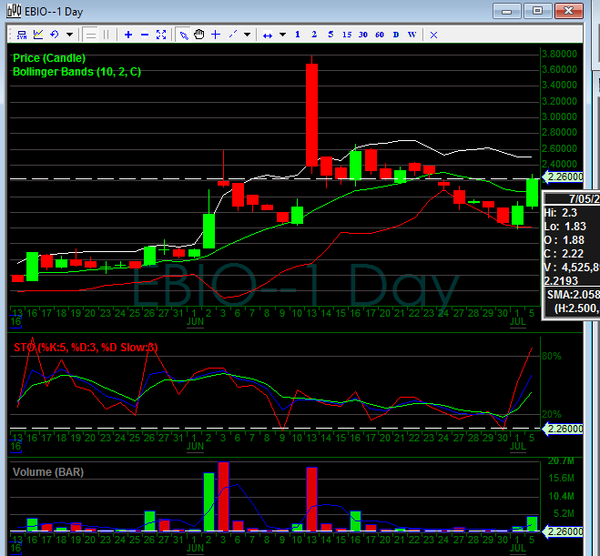 Eleven Biotheraputics (EBIO) = New Pick 2 Buy strategy #1 2.30< and #2 if lower $2.00 if higher $2.35> looking for big bar move. Has small float 5.56 million and 1.29 million shares short.