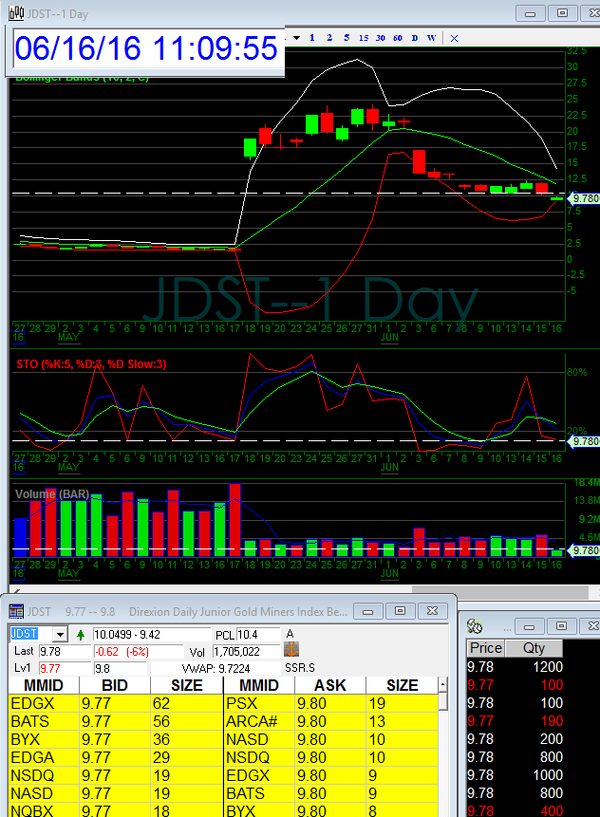 Drexion Junior Miners Bearish 3X (JDST) = once again last sold $12.00+ now $9.80 {2 Buy strategy #1 here $9.80 if lower wait $9.50< if higher buy #2 9.90+ selling into target $10.50 - $11.00} Tomorrow we add #3 higher or lower so save some BP.
