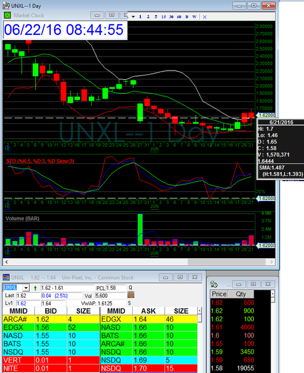 Uni-Pixel (UNXL) = Stock move is dependent upon volume. Traded 1.5 million shares yesterday and hit high $1.70 for the second time. You know what they say "third time is a charm" if it gets to $.70 may breakout. The shares short are 4 million into a float of 38 million. There is a second top at $1.87 then it can go over $2.00 and HEINZ like a magnet. Would be wonderful for this to play out and you can feel the greatness being part of the MOJO. {2 Buy strategy where #1 is under the high $1.70 and the next is doubling shares higher at $.70 -75 and holding for the plan. If lower be very patient and let it drop under $1.50 and can double there looking to sell back half at even and holding rest for higher move}