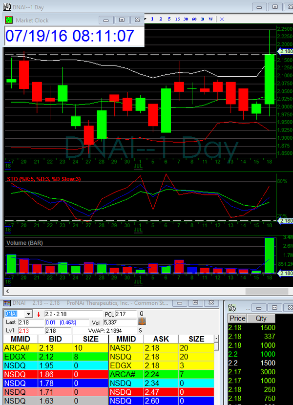 ProNai Theraputics (DNAI) = MOJO trade play was watch pick from few weeks back starting to move. If it opens down and goes lower be patient and time it well. If higher Buy Open Buy dip sell into surge. (See Image)