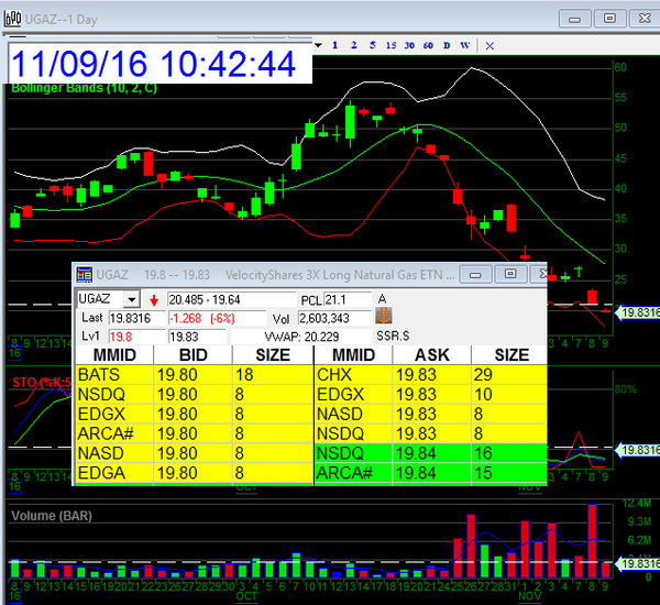 Velocity Shares 3X Long Natural Gas (UGAZ) = MOJO bounty trade play as stock is way oversold and due for a dead cat bounce back up a bit just like LABU was and today hit $40.00 from $27.00 a few days ago. Buy patiently under $20.00 with entry #1 here and #2 doubling shares either lower $19.50< or higher $20.00