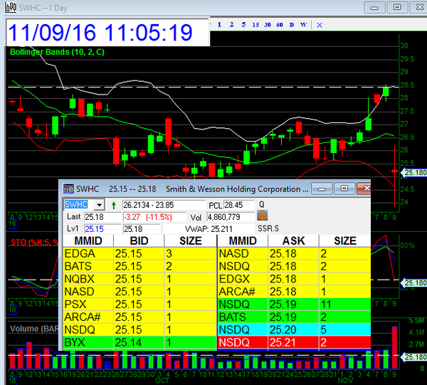 Smith & Wesson (SWHC) = MOJO Trump trade play - he loves the fact everyone should own a gun so let's take a shot (pun) at this one - same 2 buy strategy here #1 25.20< and #2 if lower wait another day and if higher buy as it approaches $25.50 then we play back up to $30.00
