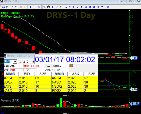 Dryships (DRYS) = in play lower risk and higher reward here at $2.00 considering the announced a special dividend to offset some of the shake out from $102 per share just a few months ago. Keeps on popping from Z$2.00 to $2.40 and back to $2.00 and has done this 3 times in last few trading sessions. If it breaks that $2.40 and goes $2.50 will really pop otherwise play some here for higher reward back to test $2.40 ( See Image)