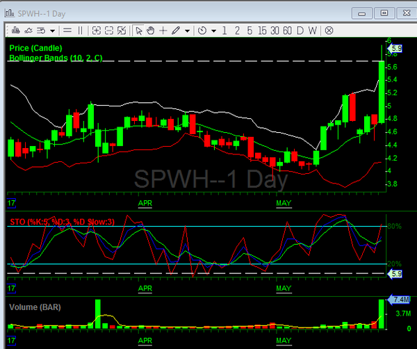 - SPWH = target thru $6.00 ONLY if has volume continuation from Friday's 7.4 million. If goes above $6.00 can hold there Upside $.60 Risk $.15