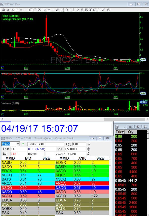Funtion(x) (FNCX)ย =ย 2ย Buy strategy in place ... New pick has trend and momo ... BUY $.65 add only higher $69 $.70ย only not lower ... if lower it goes risk small amount as initial buy is half the size as #2 buy.