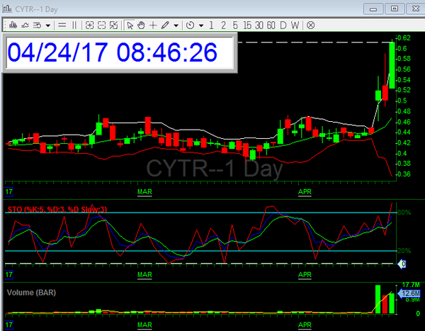 Futures up too big ... See charts above ... 2 stocks in motion this morning right here ... the CYTR and and the VRX looking for a rebound back to $9.00 range today ONLY if it heads higher this is a good trend trade to buy the open and sell the close. I may be sending you another pick after the open .... stay tuned.