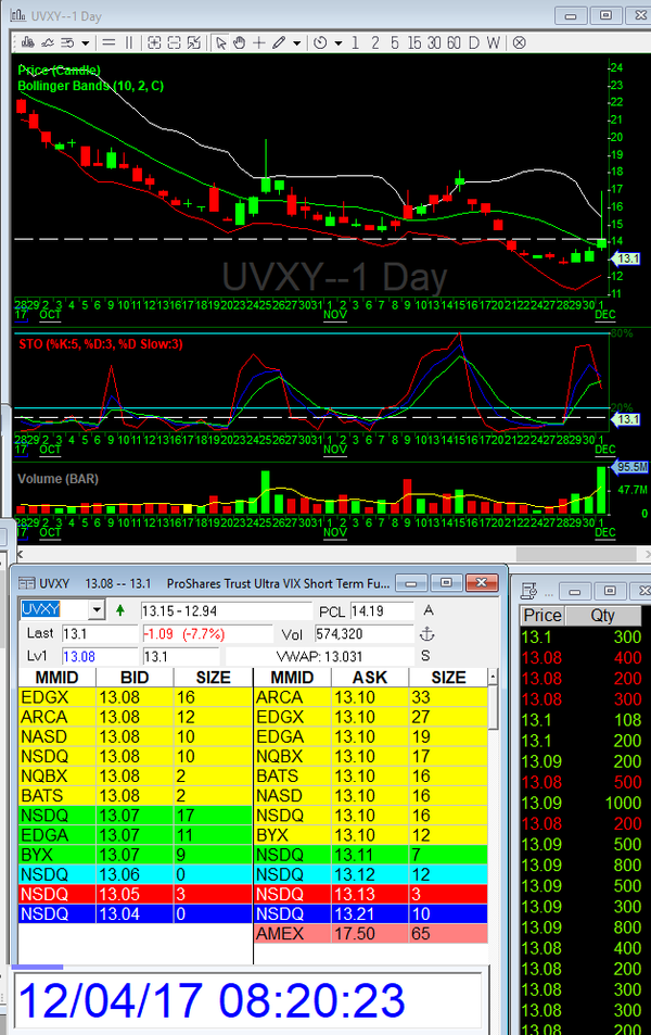 Proshares Ultra VIX Short Term Futures: SYMBOL = UVXYÂ = looks good for market correct rest of this week. We sold last week into the $17.00 spike now at $13.00 a bargain. Do it again.Â