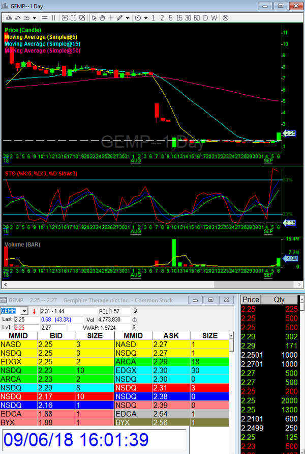 Gemphire Theraputicss: SYMBOL = GEMP = Mojo play for one direction only closes towards high of the day will gap and continue tomorrow. Last $2.25 first target $2.50 mini-heinz then Heinz $3.00