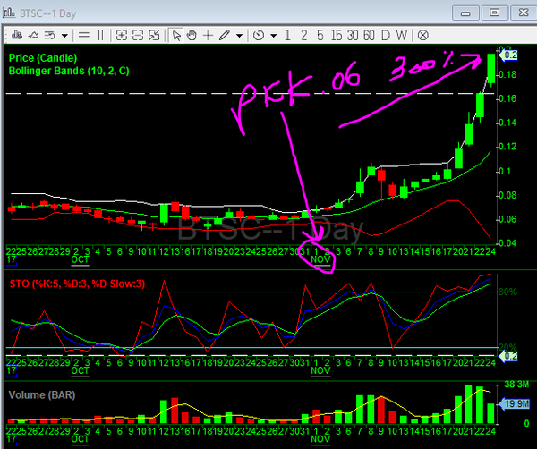SYMBOL = BTCS = last price $.1125 ... BTCS is an early entrant in the Digital Asset market and one of the first U.S. publicly traded companies to be involved with Digital Assets and blockchain technologies.Â