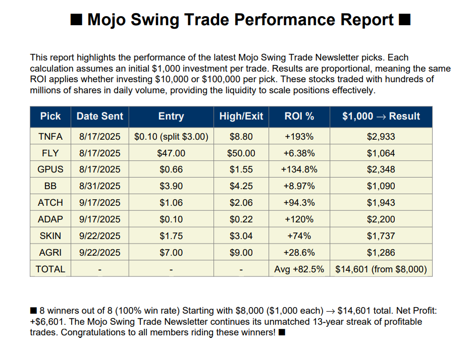 💥 What a run! The Mojo Swing Trade Newsletter has once again delivered an unbroken streak of winners — 8 picks, 8 wins, and an average ROI of +82%. Whether you’re trading with $1,000, $10,000, or even $100,000 per position, the results scale the same — and with hundreds of millions of shares traded daily, the liquidity is always there.